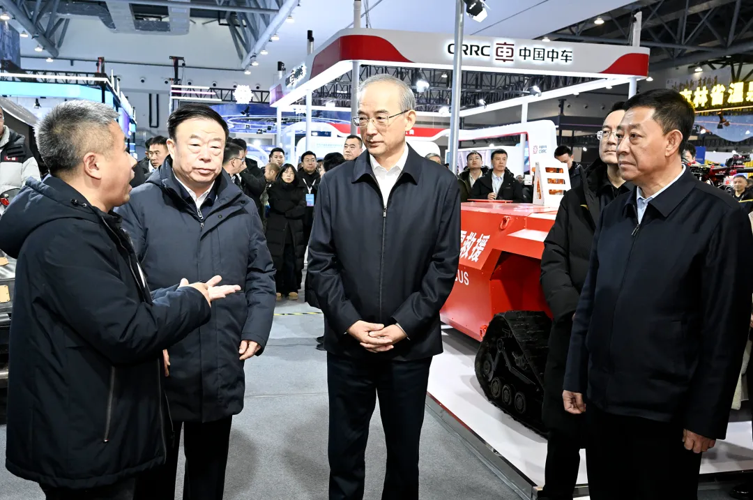 12月18日,省委书记黄强,省委副书记、省长胡玉亭实地调研第九届吉林冰雪产业国际博览会办展情况,认真听取冰雪特种车辆性能特点介绍。